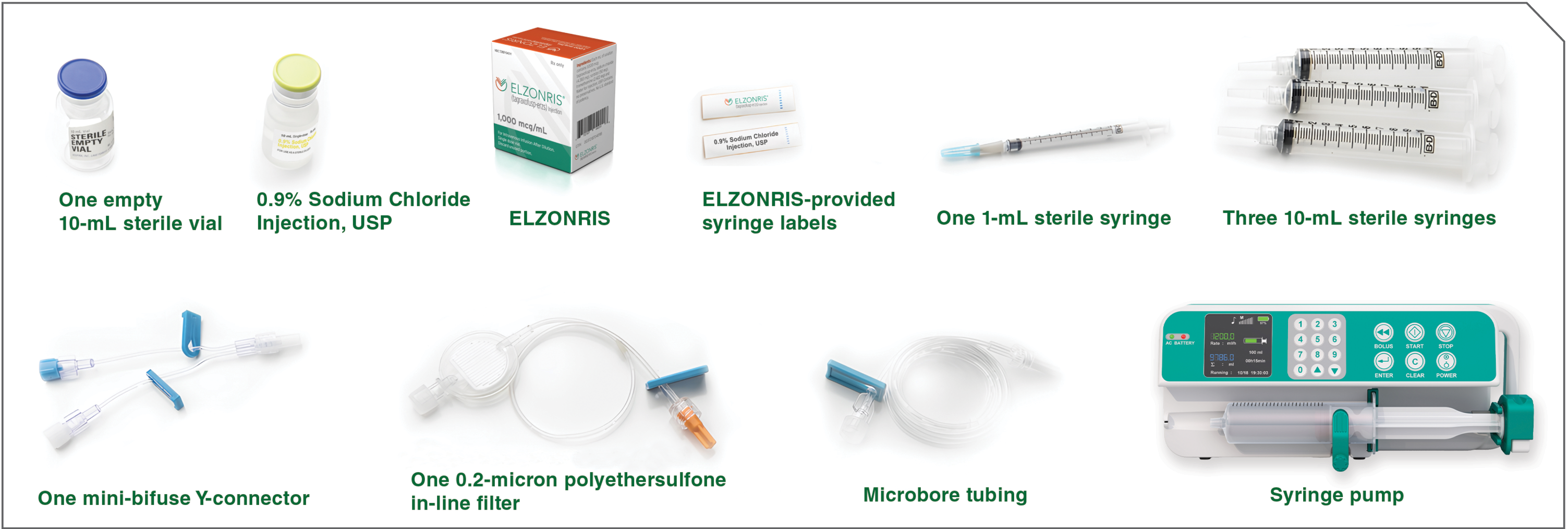 Before initiating the ELZONRIS dose preparation process, make sure you have everything you need, including your institution’s preferred syringe pump.