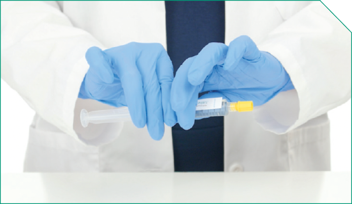 Next, take a new 10-mL sterile syringe... ![]() and fill it with at least 3 mL of 0.9% Sodium Chloride Injection, USP. This will be the 0.9% Sodium Chloride Injection, USP flush syringe. The 0.9% Sodium Chloride Injection, USP flush will be used to push out the full required dose of ELZONRIS to the patient at the end of the infusion. ![]() |